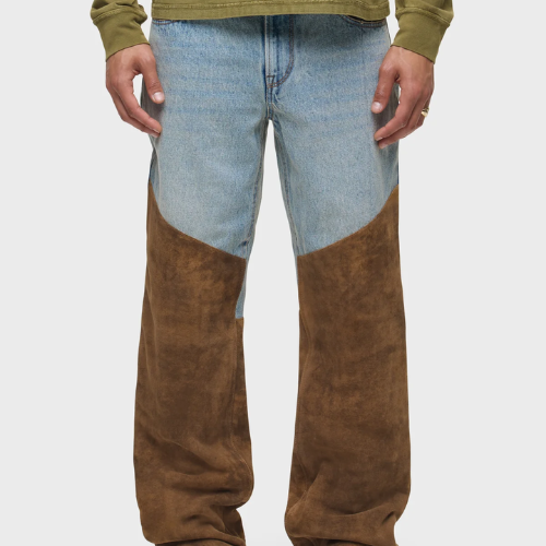 The Denim Suede Work Pant in Monroe blends classic Americana with Hudson’s directional streetwear aesthetic. Built from vintage-washed cotton denim, the upper section keeps things familiar until you hit the knees. That’s where things shift. Below the break, rich brown calf suede takes over, wrapping the lower leg with a texture-forward contrast that nods to Western grit while staying rooted in fashion-forward design. The relaxed fit gives it movement, while the heavyweight materials bring structure. This is a piece designed to be seen and styled with intention.